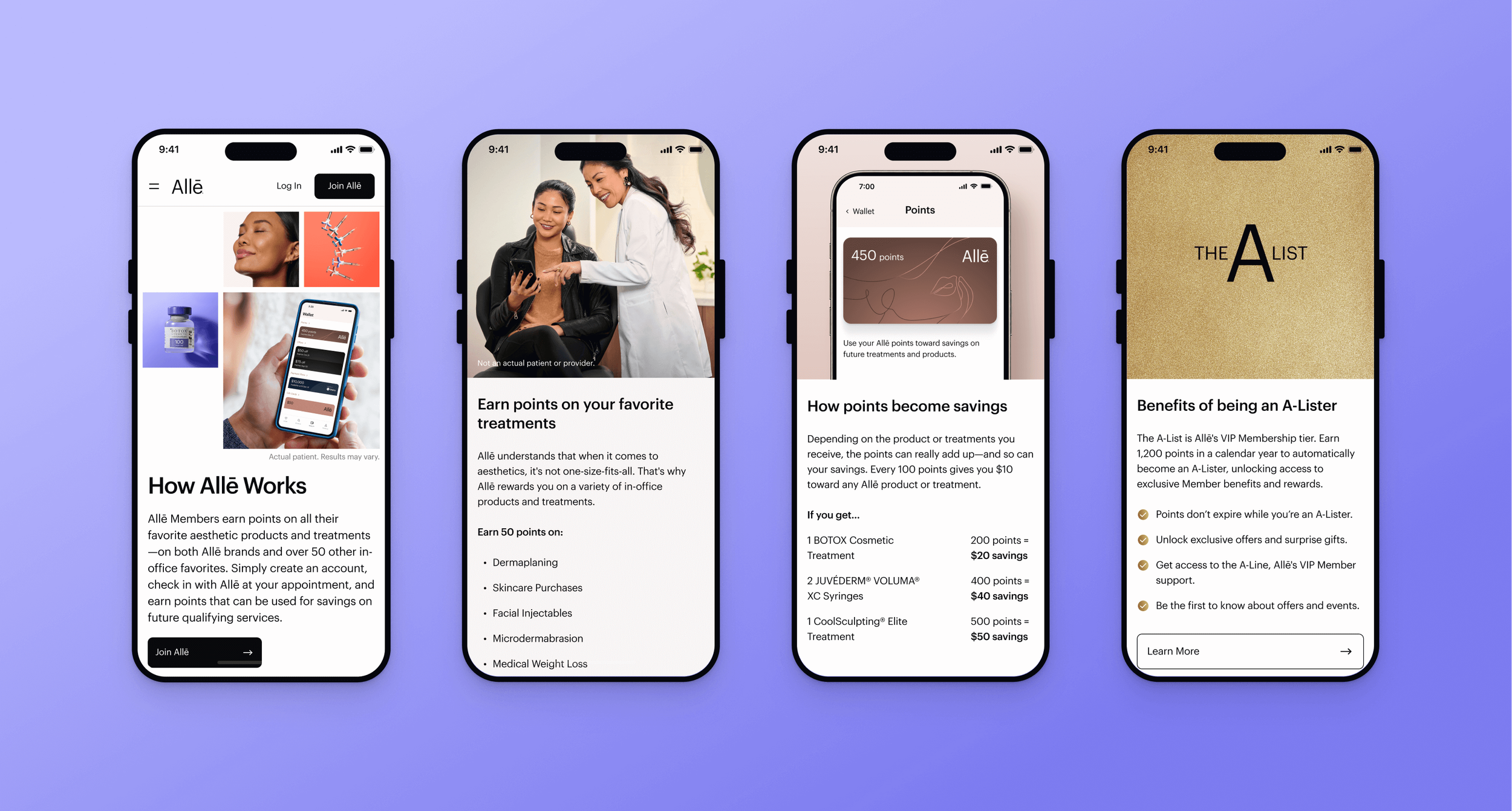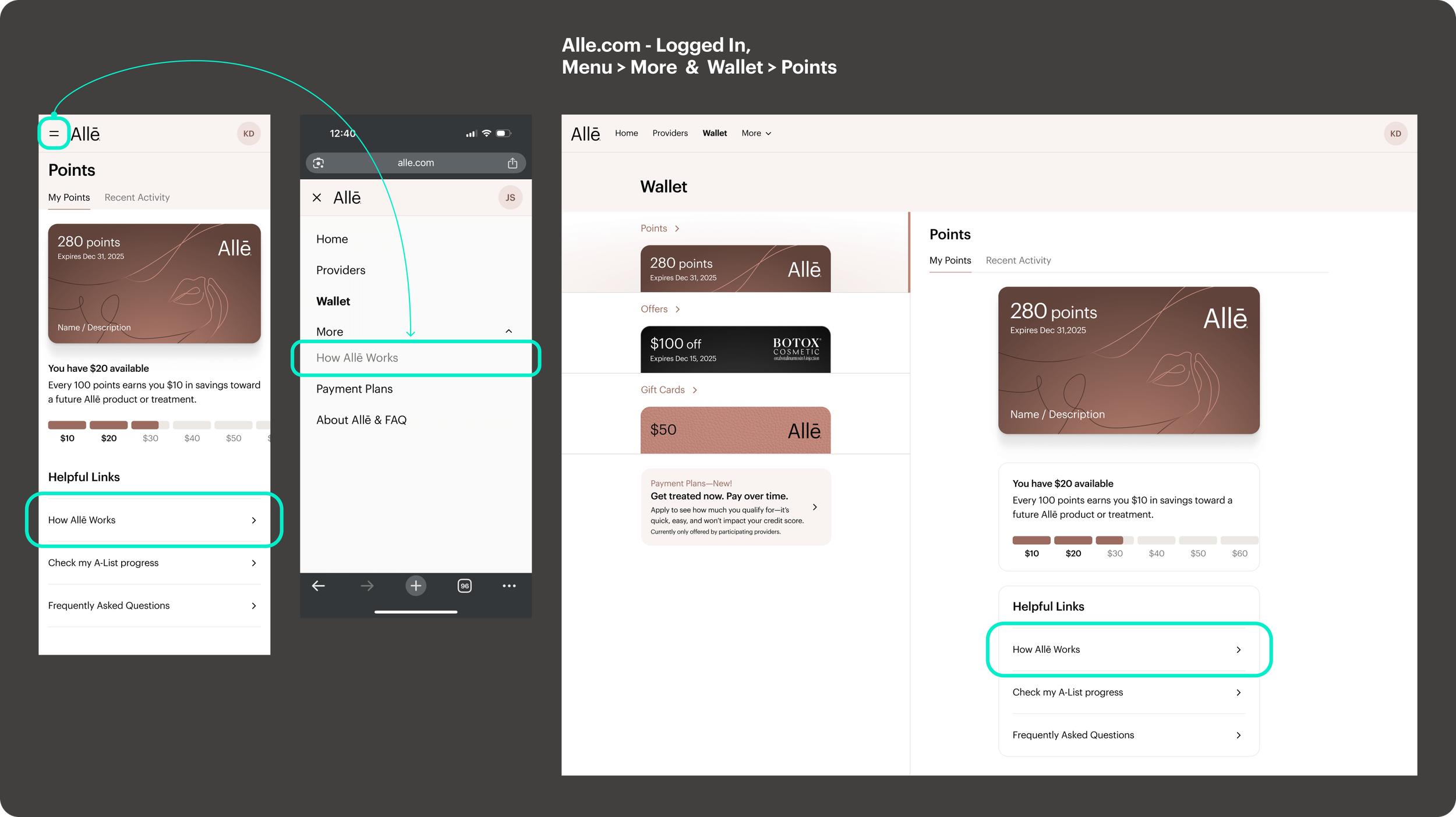 The goal is to provide our consumers the resources to successfully manage their experience; which encompasses Wallet (points, offers, gift cards and payment plans), Profile (A-List progress, Treatment History) and more. This page was built to serve as an educational reference, reachable from the Alle.com homepage, as well as within the app.